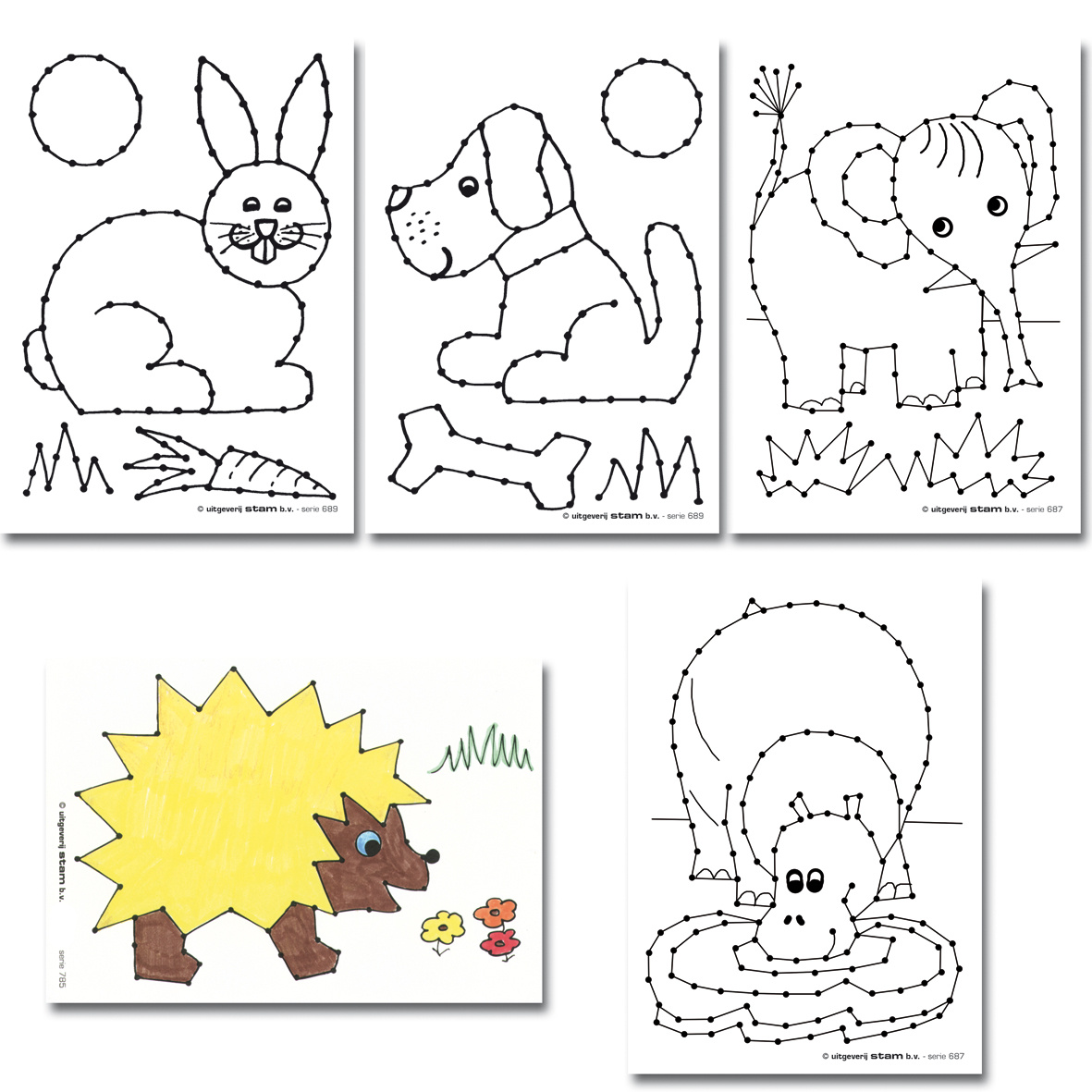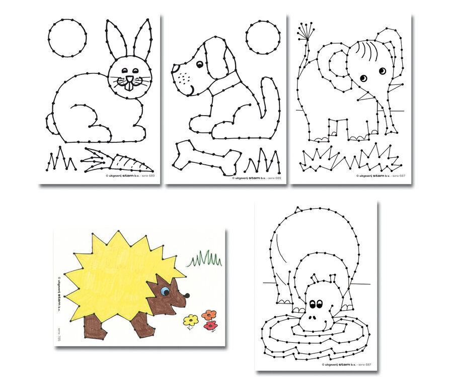 Tip: Laat de kinderen eerst alle gaatjes doorprikken op een prikkussen, zodat ze aan de achterkant kunnen zien waar ze de naald terug moeten steken.