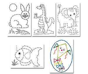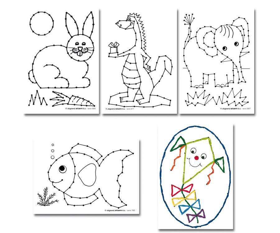 Knip een flink stuk draad af en doe dat in een naald. Borduur dan het figuur, zoals het met puntjes is aangegeven op de tekening. Er zijn puntjes voorgedrukt waar de kinderen hun naald met draad doorheen kunnen steken