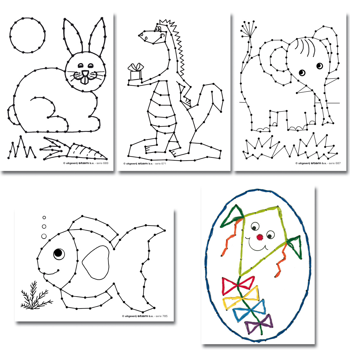 Tip: Laat de kinderen eerst alle gaatjes doorprikken op een prikkussen, zodat ze aan de achterkant kunnen zien waar ze de naald terug moeten steken.