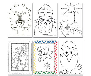 Knip een flink stuk draad af en doe dat in een naald. Borduur dan het figuur, zoals het met puntjes is aangegeven op de tekening. Er zijn puntjes voorgedrukt waar de kinderen hun naald met draad doorheen kunnen steken