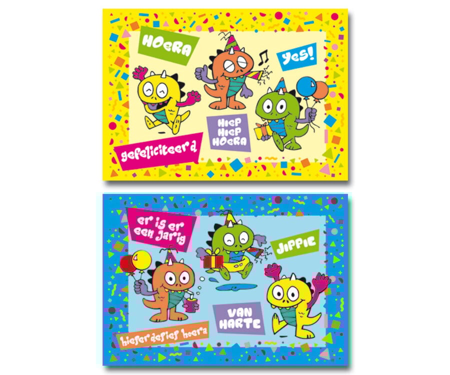 Twee verschillende afbeeldingen van lieve draakjes met een felicitatie tekst op reuzewenskaartenformaat (21x30 cm)