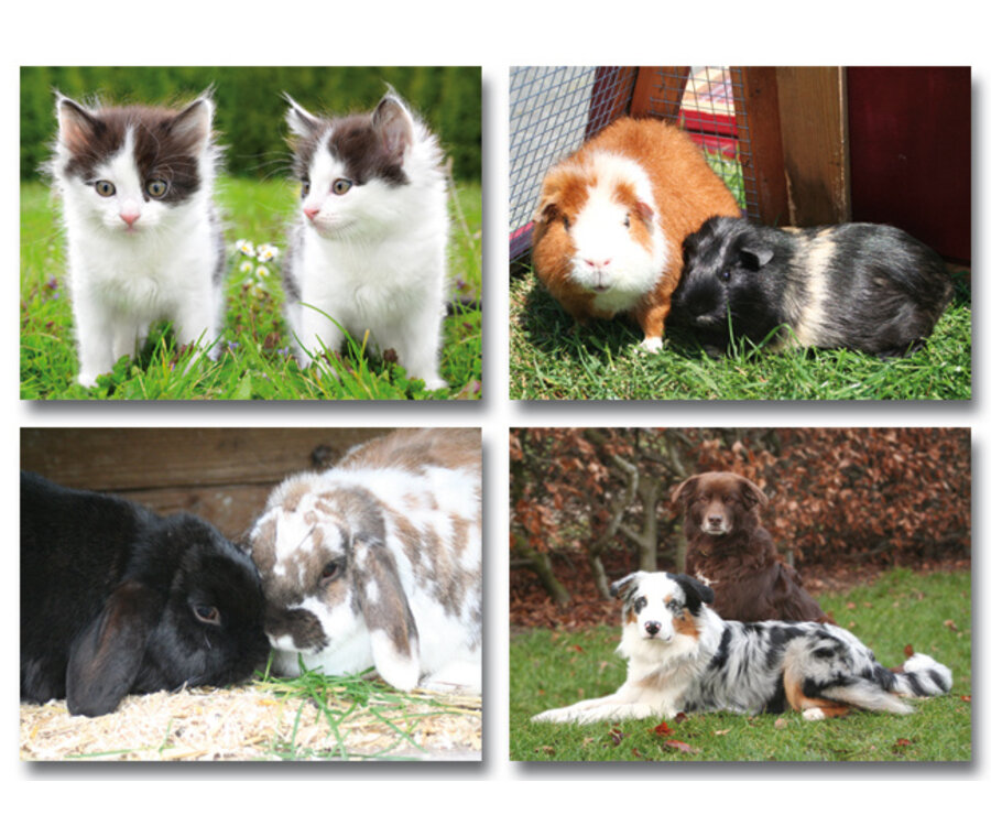 4 verschillende afbeeldingen met huisdieren op A5 formaat (grote ansichtkaart)