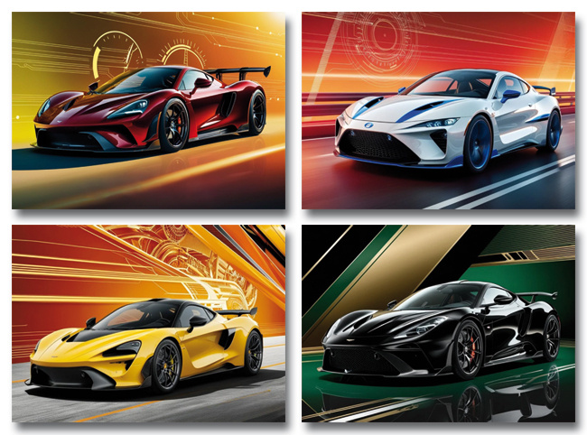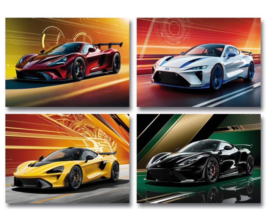 1 set van 4 grote kaarten (A5) 'snelle' auto's