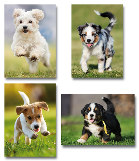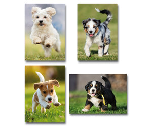 Kleine kaarten van jonge honden, vier verschillende afbeeldingen.