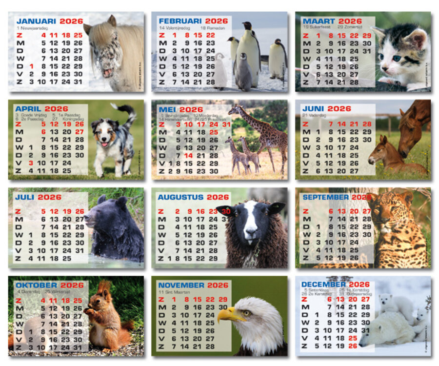 Dit kalenderblokje is 5 x 8,5 cm. groot en bestaat uit 12 maandblaadjes, een voorblad en een kartonnen achterblad.