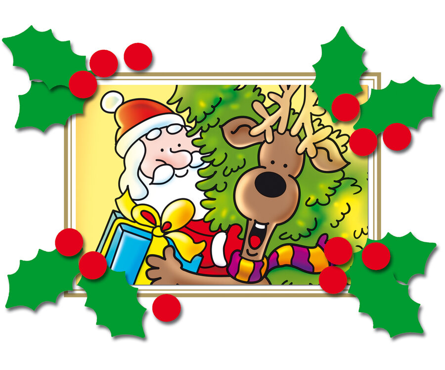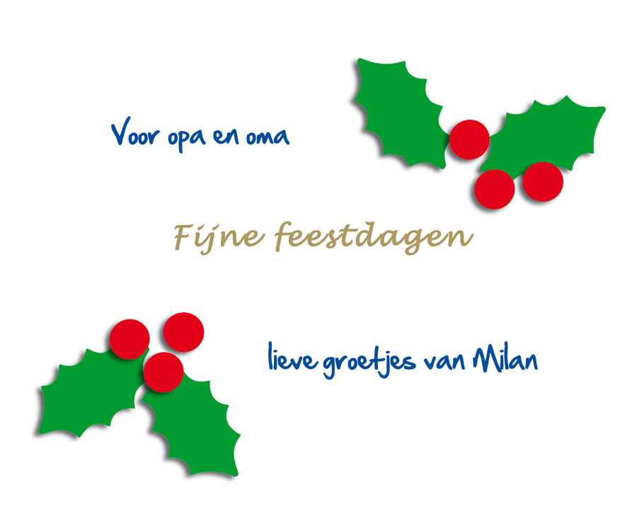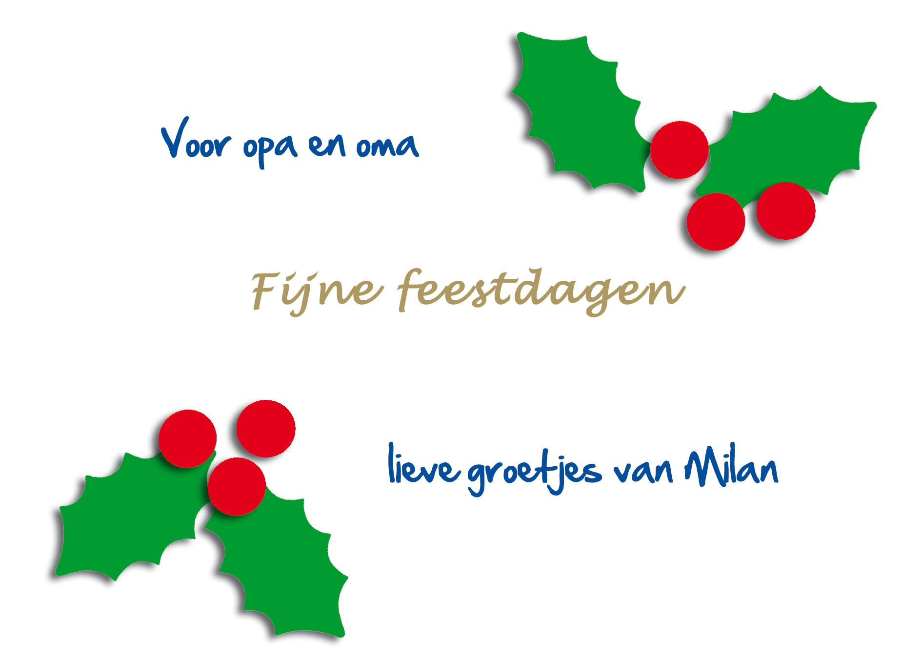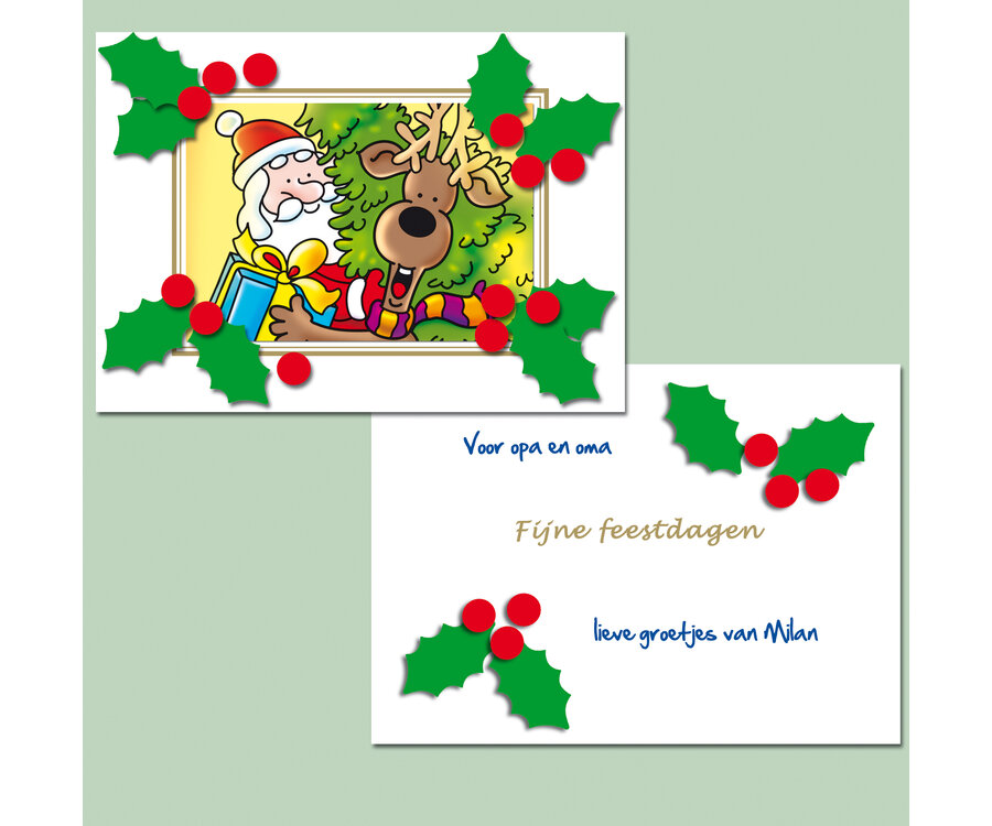 Plak de kleine kaartjes op de basiskaart en versier hem met de hulst met besjes.
